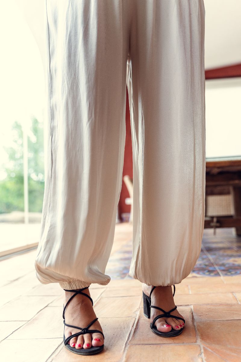 El pantalón satén beige es fácil de combinar con diferentes prendas y estilos. Para un look casual, se puede llevar con una camiseta de algodón y sandalias; mientras que, para un conjunto más formal, una camisa de lino o una blazer lo complementan a la perfección.